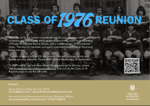 The Class of 1976 are invited to celebrate this 50-year milestone at a reception and celebratory dinner in the school dining room on the evening of Friday, 16 October, with a contemporary 1970’s themed menu.