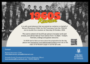 The Class of 1964 reunion in a celebration of their 80th birthday. Organised by Richard Stevenson CO64. Old Truronians from in and around that year are welcome to come. Friends, family and siblings welcome. The reunion will include a tour of the school, lunch and a formal dinner.