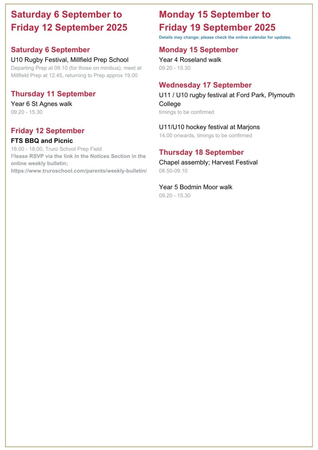 It was a pleasure to see many of you at the Friends of Truro School (FTS) coffee morning today. For those of you who were unable to make it, please make note of the FTS barbecue and picnic on Friday, the 12th, and the Macmillan coffee morning on Friday, 26th September.