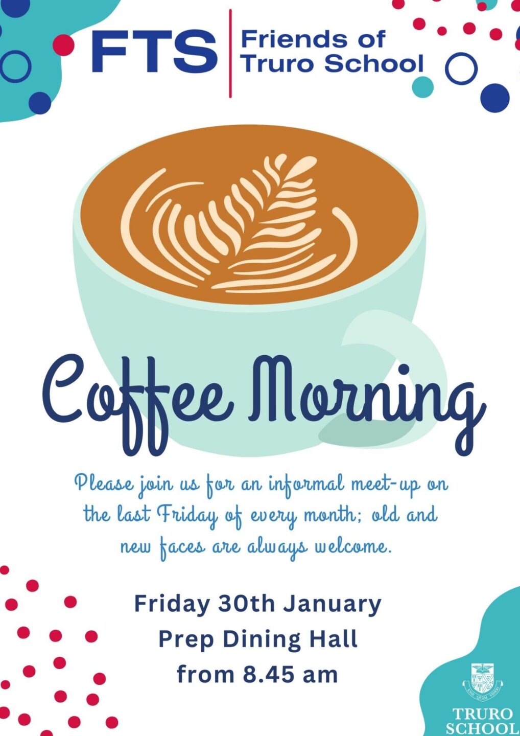 Please note, the first FTS Coffee Morning of the year will be held on Friday, 30th of January, from 8.45am in the Prep Dining Room.