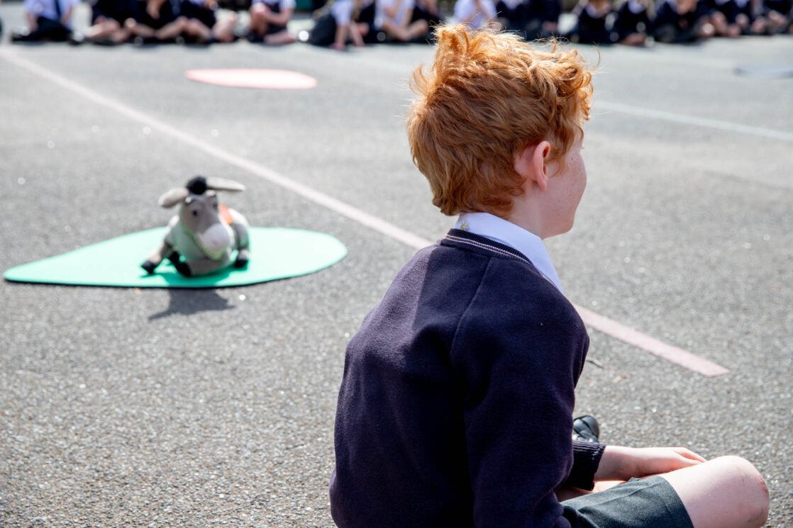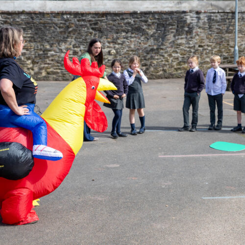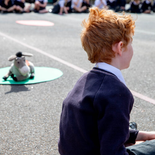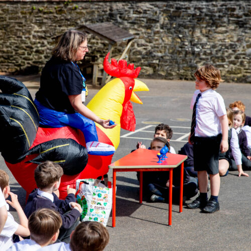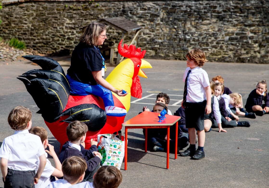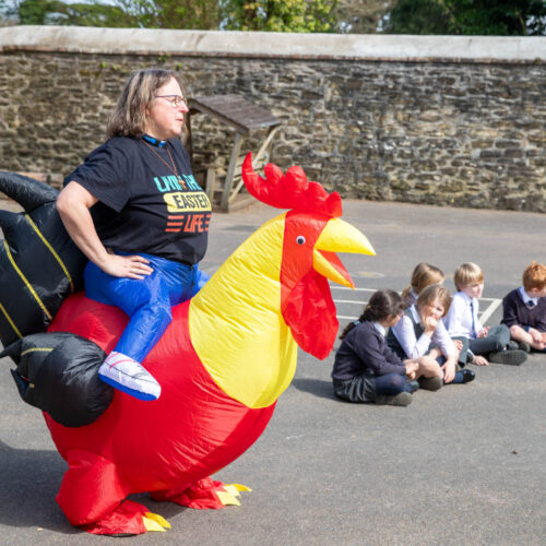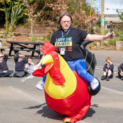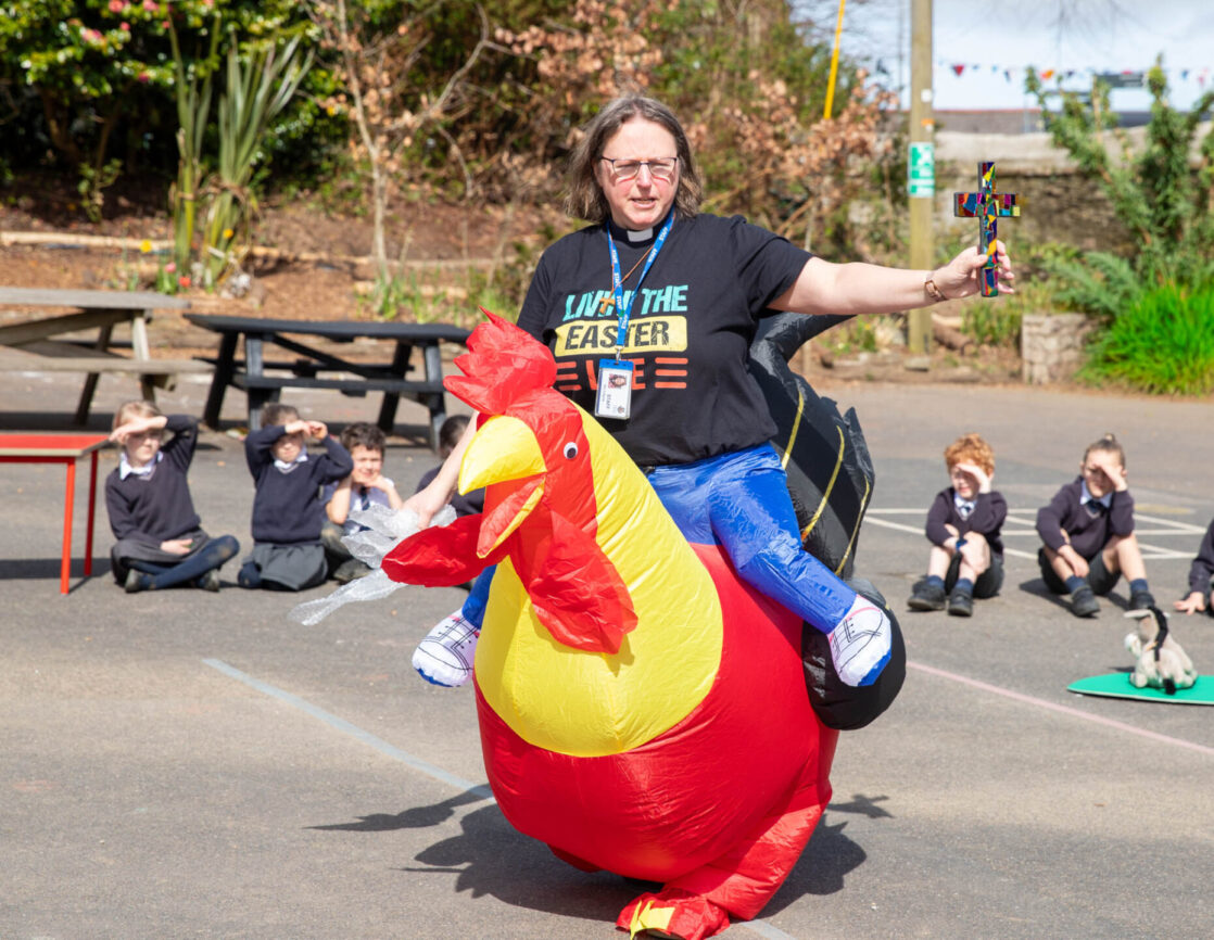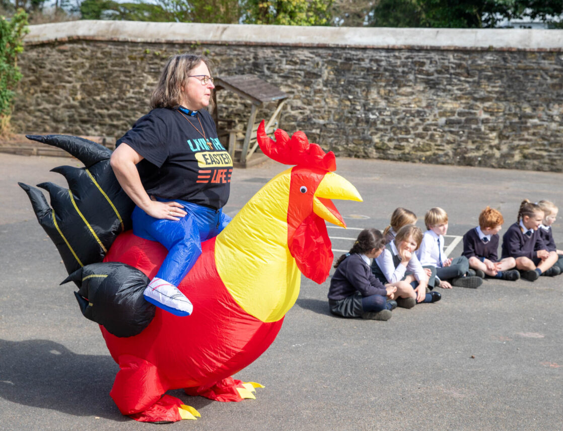 Dressed as a rooster, a symbol of the moment Peter denied knowing Jesus three times, but also one of hope and forgiveness, Rev Helen led the service in the sunshine on the Pre-Prep playground.