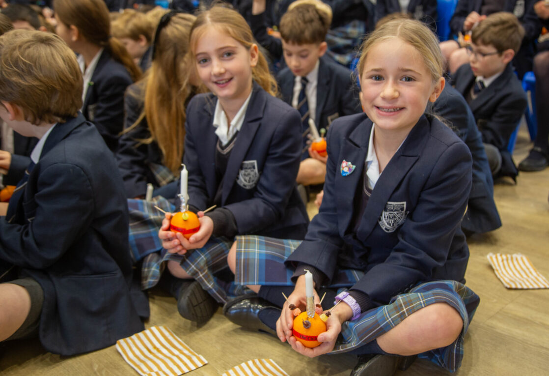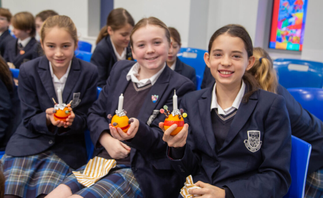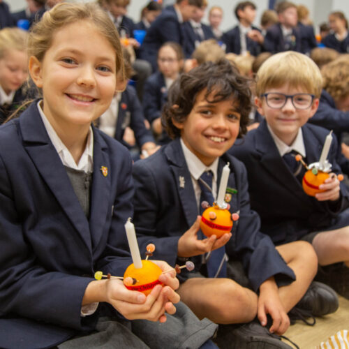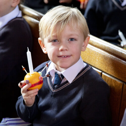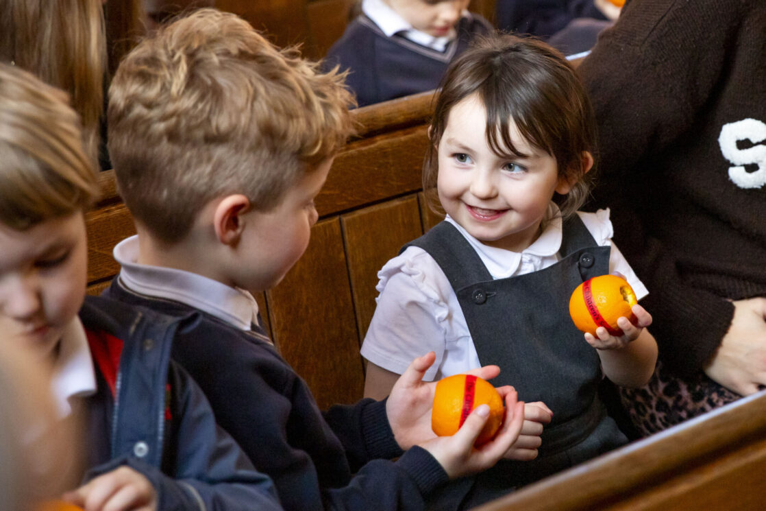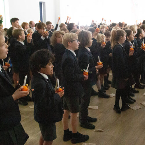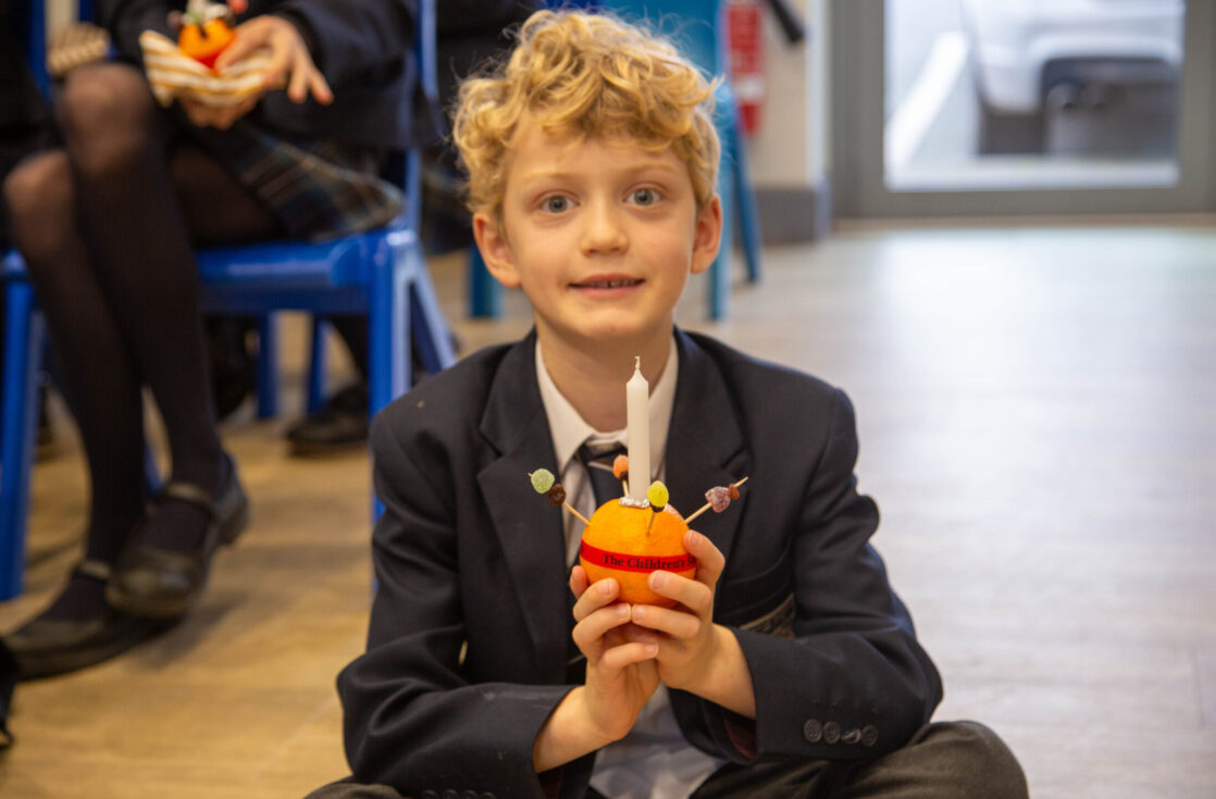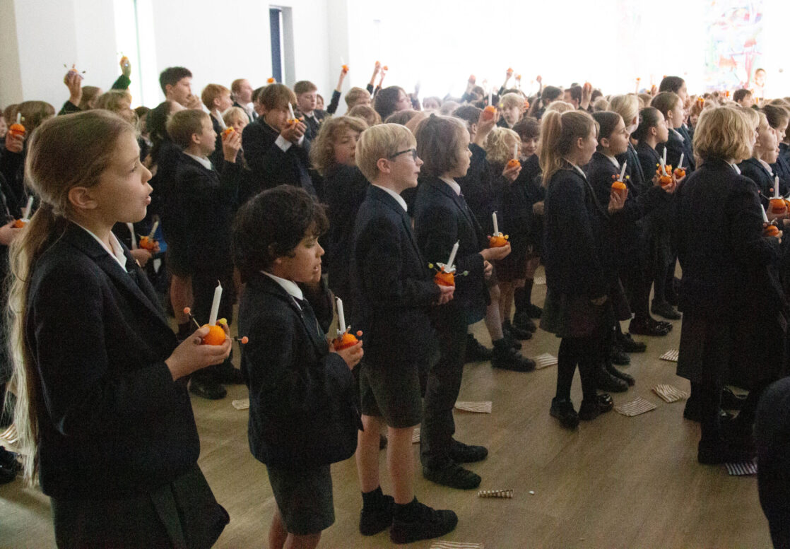 During each assembly, through a blend of songs, storytelling and reflection, pupils explored the symbolism found in each part of the Christingle. The orange, representing the world, is first wrapped in a red ribbon to symbolise Jesus’ humanity, divinity, love and guidance. The four cocktail sticks represent the four seasons and the corners of the Earth, while the fruits and raisins decorating the orange symbolise the sweetness of Christ and serve as a reminder of his presence in the communion bread and wine.