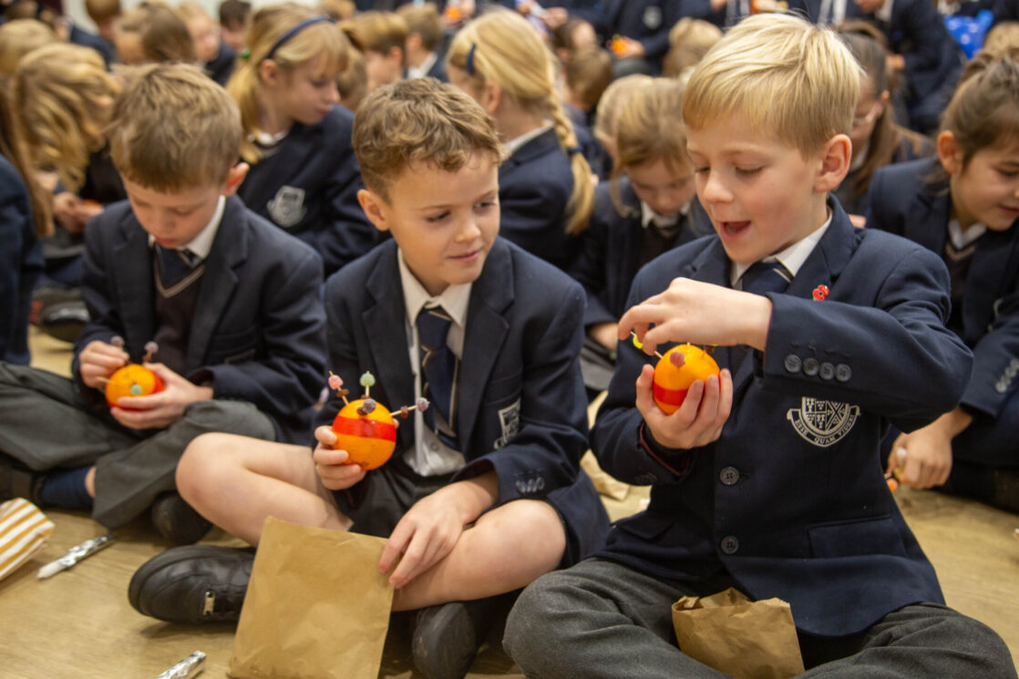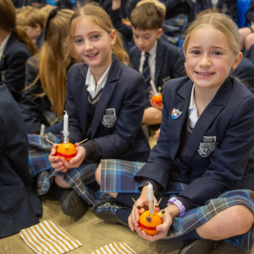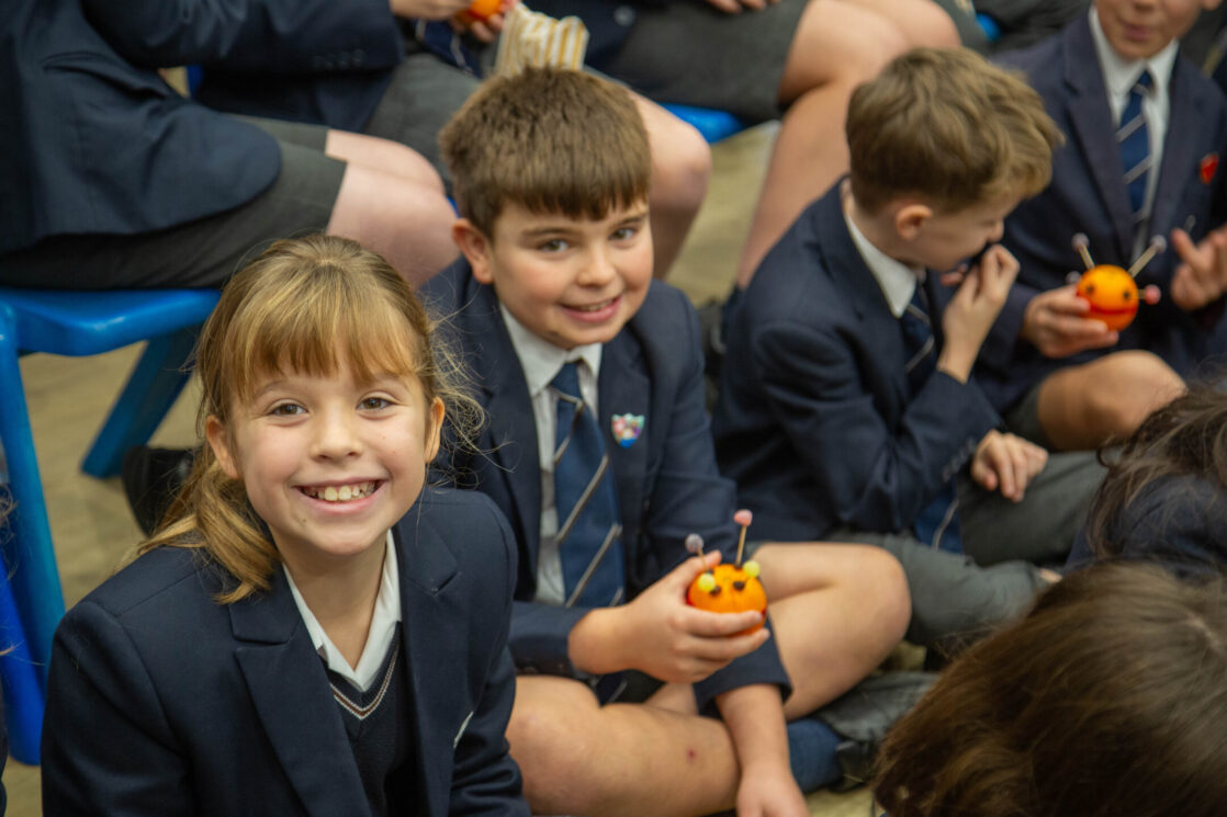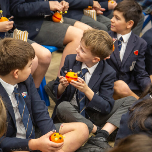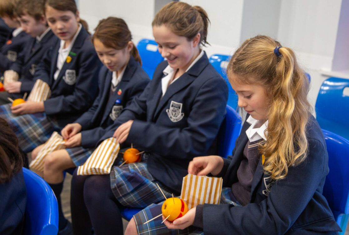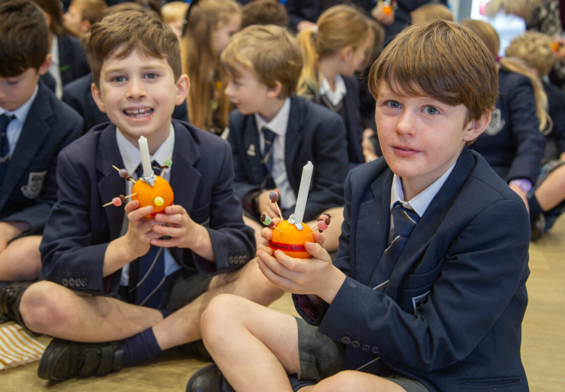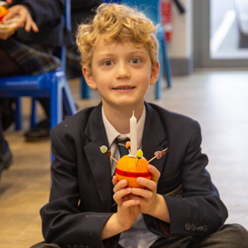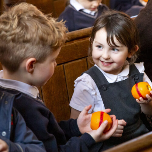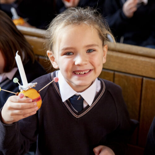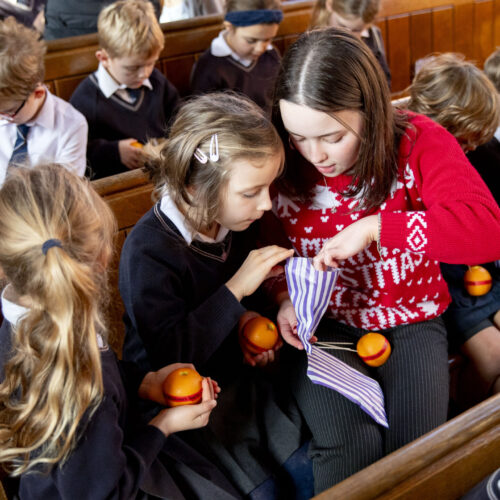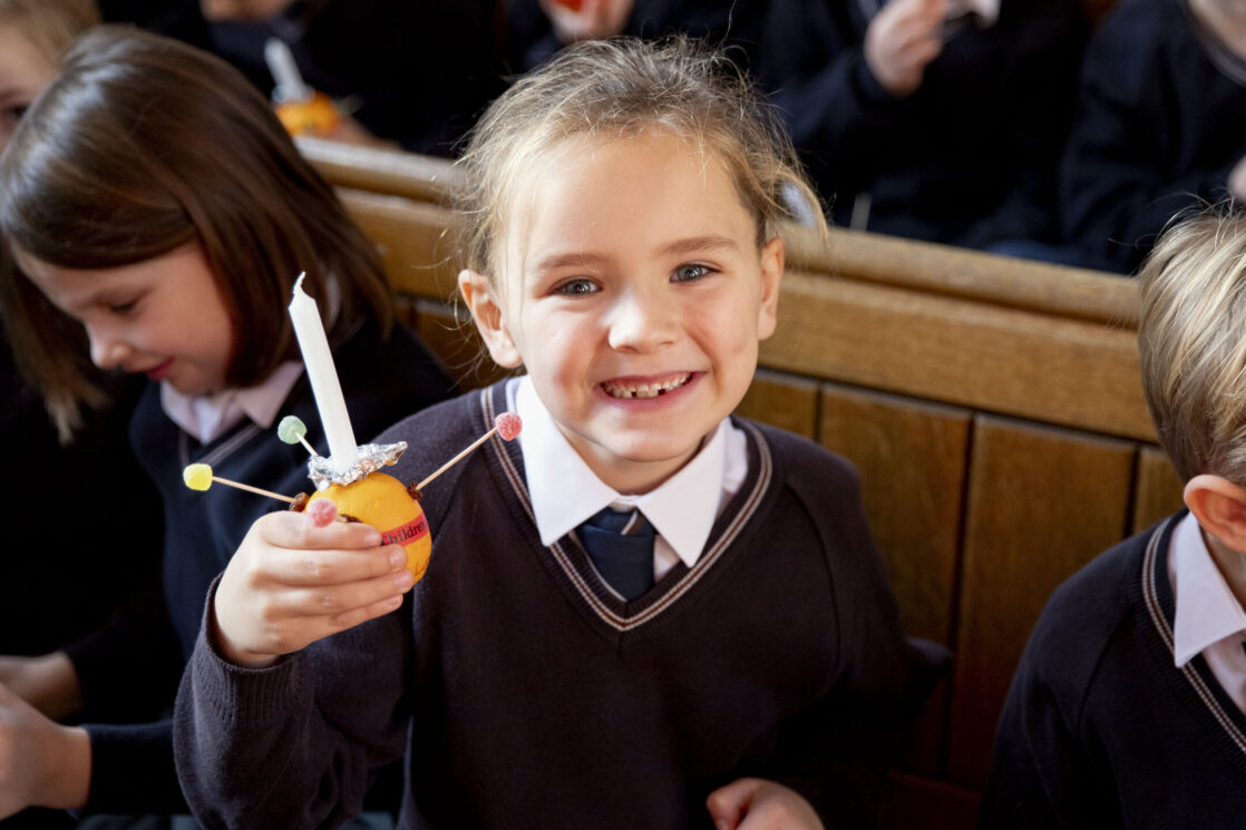 During each assembly, through a blend of songs, storytelling and reflection, pupils explored the symbolism found in each part of the Christingle. The orange, representing the world, is first wrapped in a red ribbon to symbolise Jesus’ humanity, divinity, love and guidance. The four cocktail sticks represent the four seasons and the corners of the Earth, while the fruits and raisins decorating the orange symbolise the sweetness of Christ and serve as a reminder of his presence in the communion bread and wine.