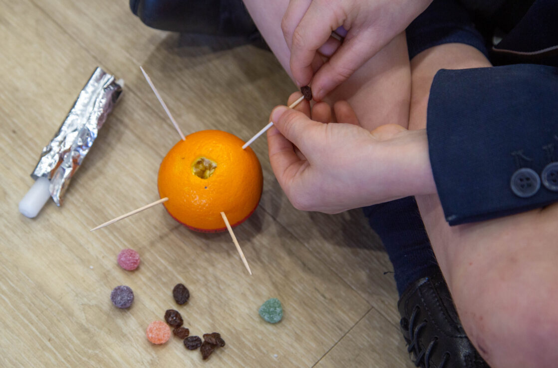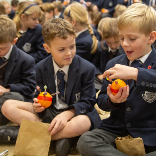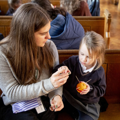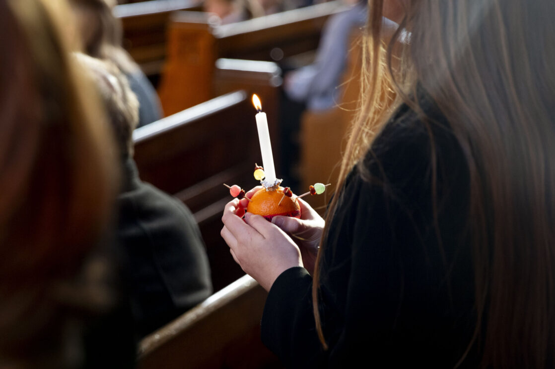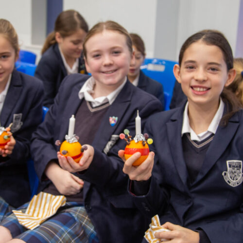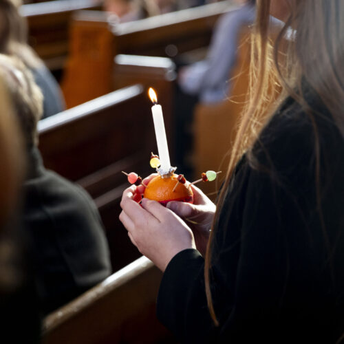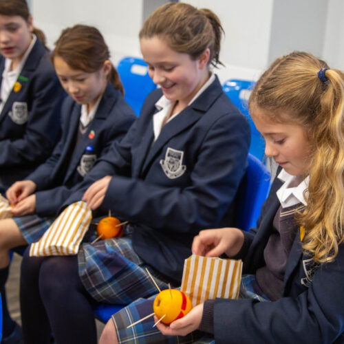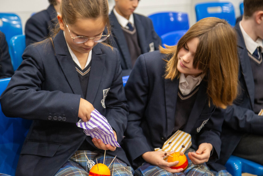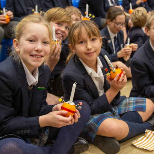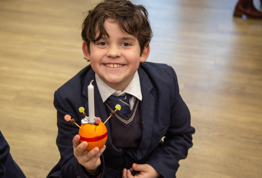 During each assembly, through a blend of songs, storytelling and reflection, pupils explored the symbolism found in each part of the Christingle. The orange, representing the world, is first wrapped in a red ribbon to symbolise Jesus’ humanity, divinity, love and guidance. The four cocktail sticks represent the four seasons and the corners of the Earth, while the fruits and raisins decorating the orange symbolise the sweetness of Christ and serve as a reminder of his presence in the communion bread and wine.