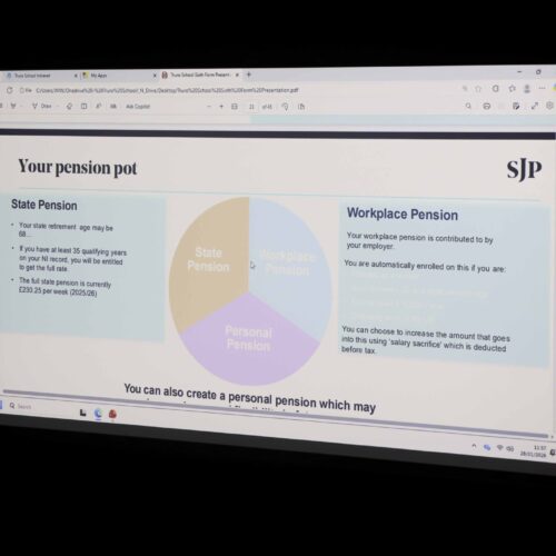As students approach a time of change, with increasing financial responsibilities and the prospect of entering higher education and the workplace, Julia advised the importance of starting early. She highlighted that consistency matters more than scale, encouraging students to begin small rather than delaying larger investments until later in life. Using graphs and case studies, she demonstrated how investments can grow over time and introduced students to a range of saving and investment options, including workplace, private and state pensions, ISAs, bonds, shares and property.