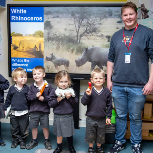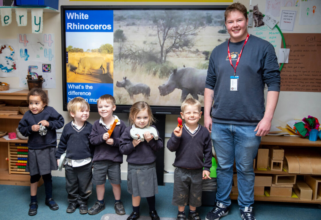 The week began with the Pre-Prep welcoming wildlife conservationist James Sampson, who has worked with a range of charities. He spoke to the Nursery children about African animals, focusing especially on rhinos and how dehorning is used to protect them. He also engaged the group with a quiz to identify African animals. He introduced the idea of “dogs with jobs,” highlighting how specially trained dogs help deter poachers and keep rhinos safe.