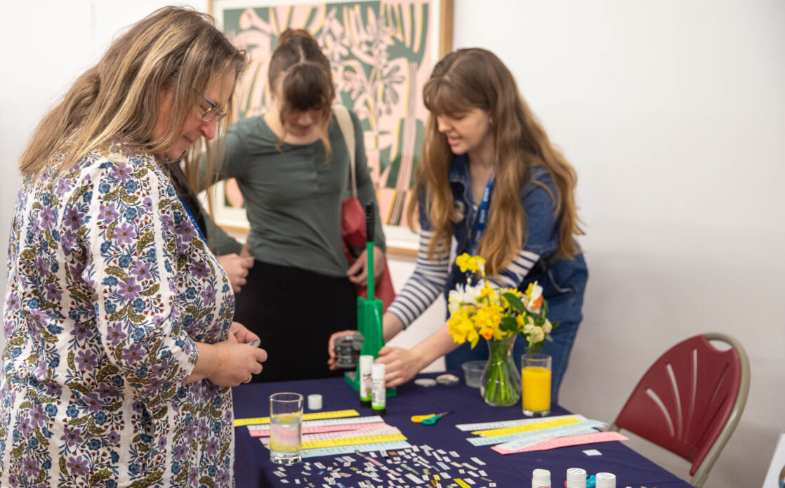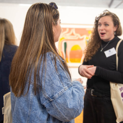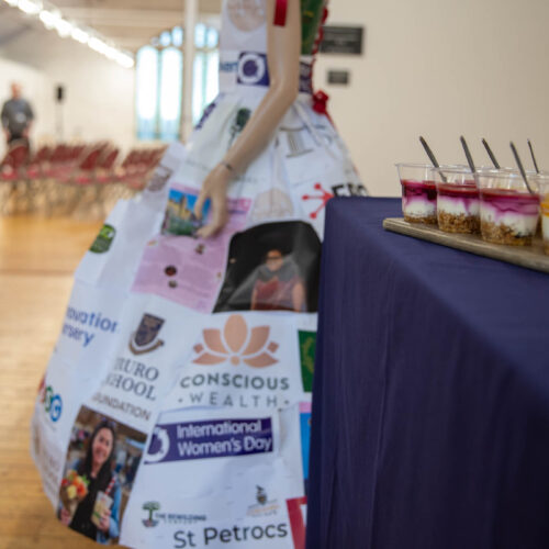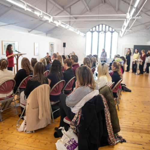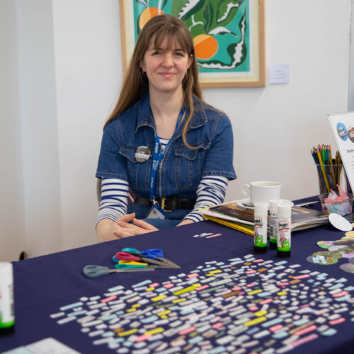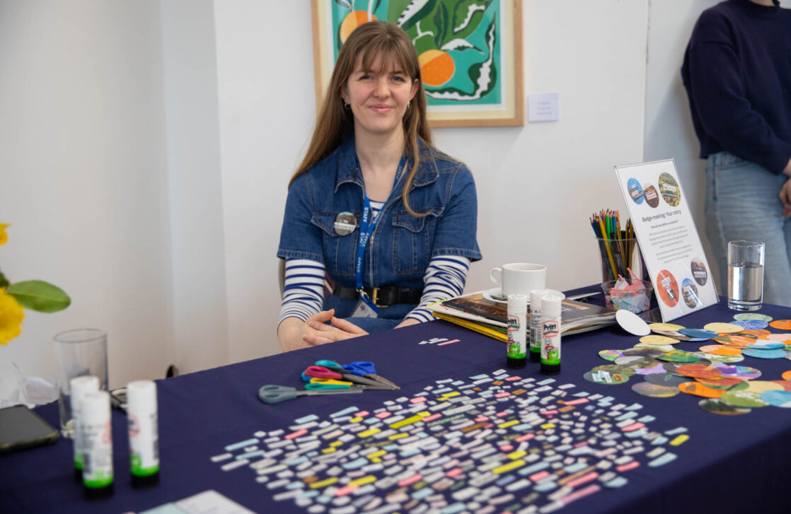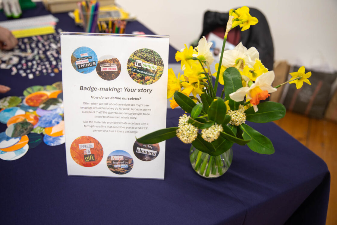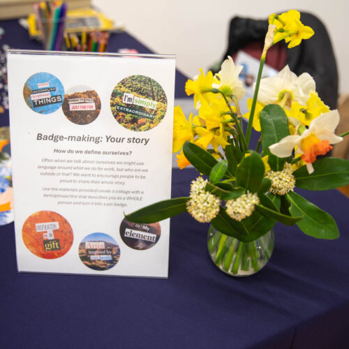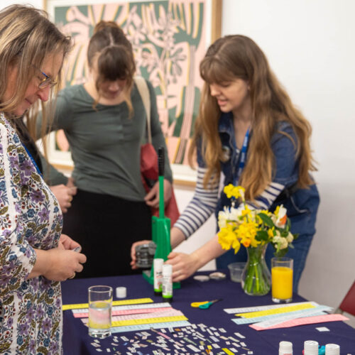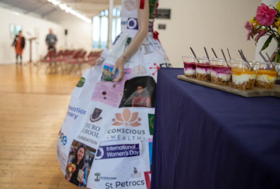 Alongside the talks, guests were also invited to create their own badges with Artist in Residence, Rachael Coward. By choosing colours and words that represented their passions, feelings or personal values, attendees created unique keepsakes to take home alongside their goodie bags. The gallery was decorated to celebrate International Women’s Day with a mannequin wearing a dress adorned with the logos of all of our attendees’ businesses.