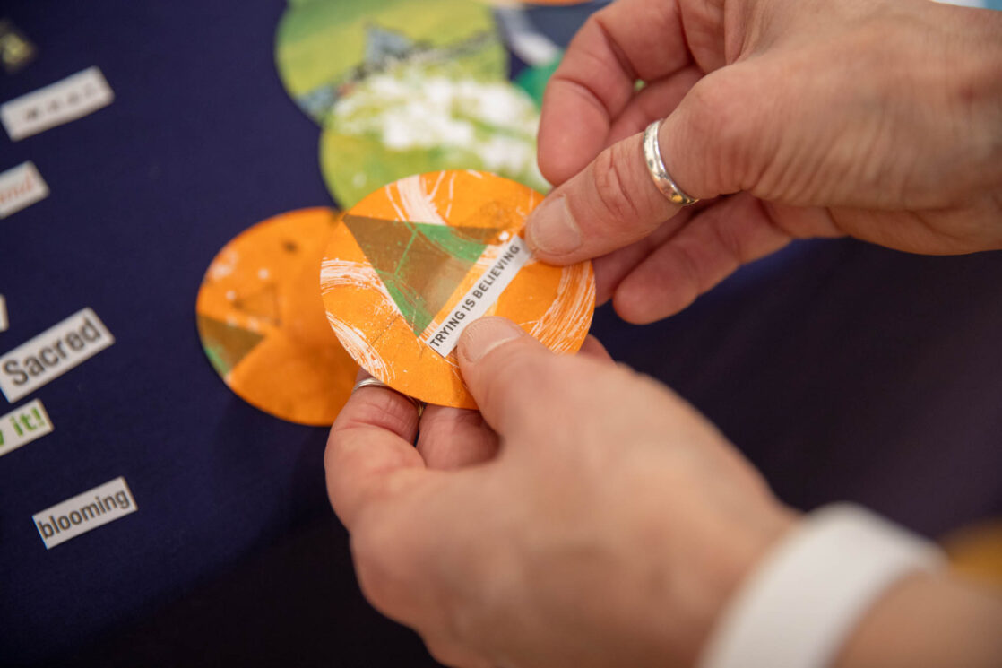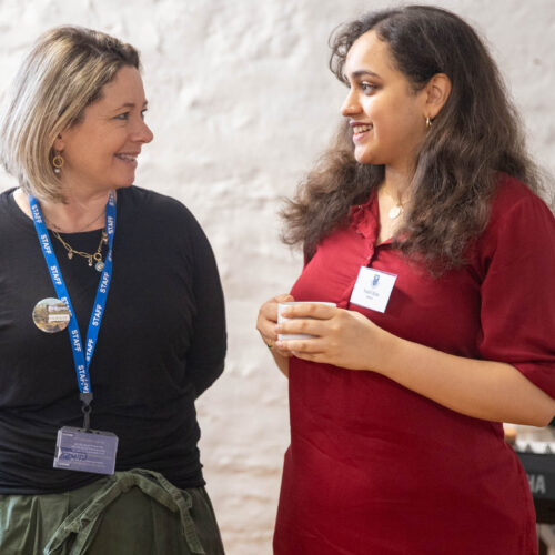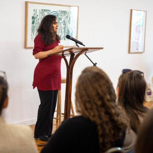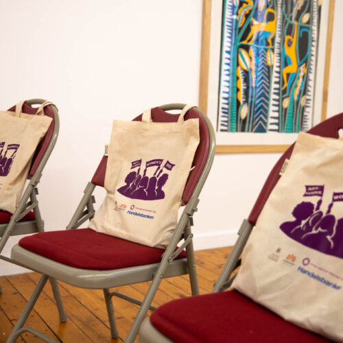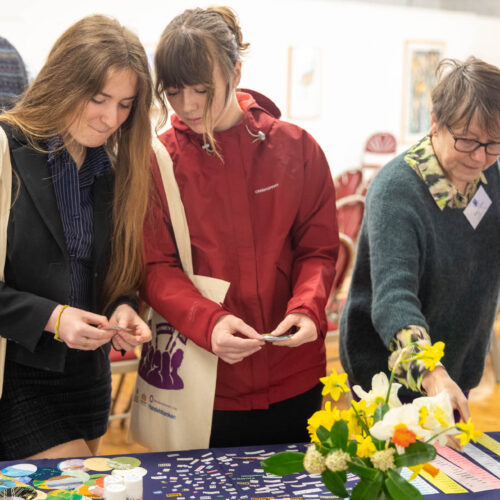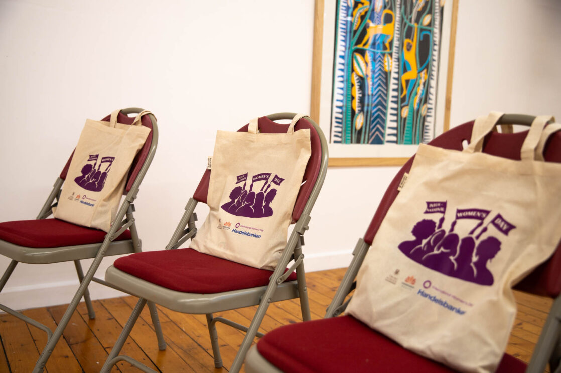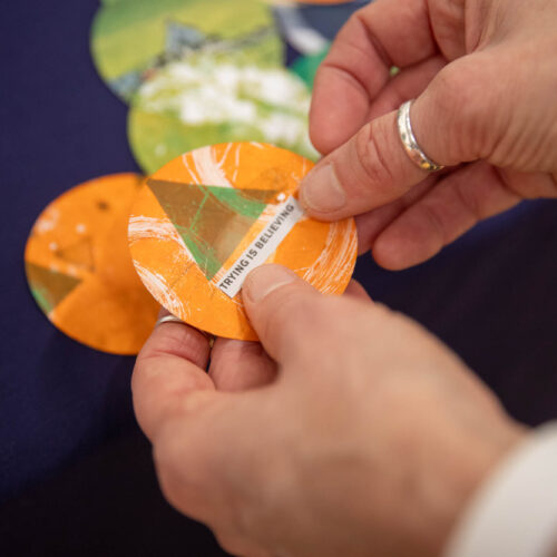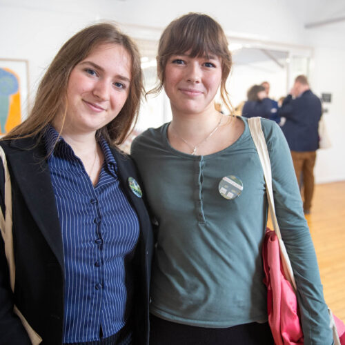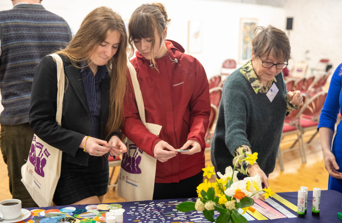 Alongside the talks, guests were also invited to create their own badges with Artist in Residence, Rachael Coward. By choosing colours and words that represented their passions, feelings or personal values, attendees created unique keepsakes to take home alongside their goodie bags. The gallery was decorated to celebrate International Women’s Day with a mannequin wearing a dress adorned with the logos of all of our attendees’ businesses.