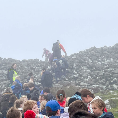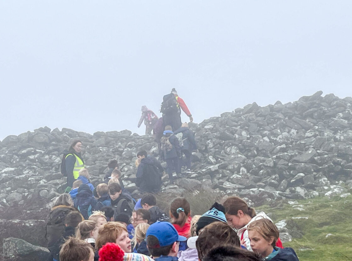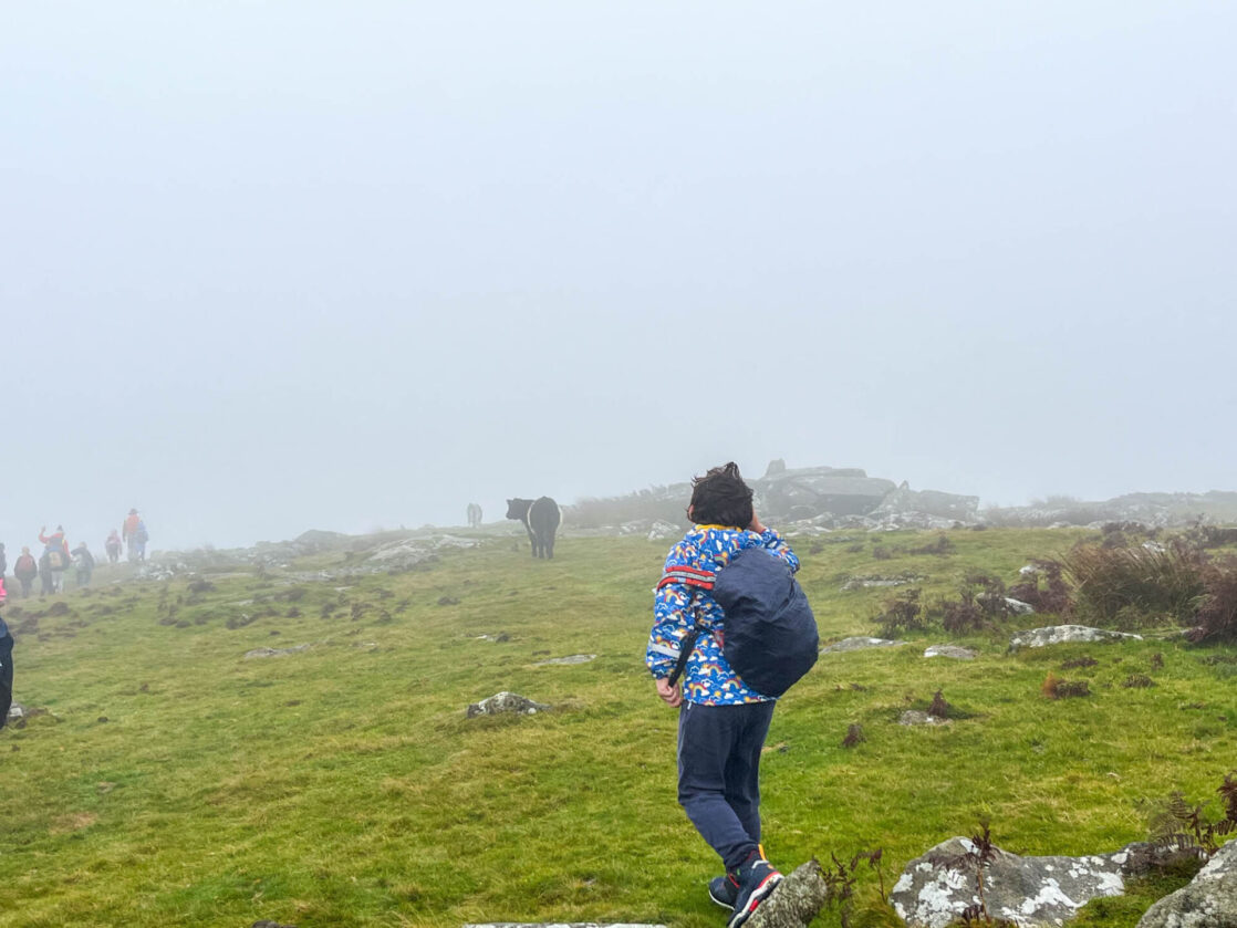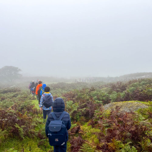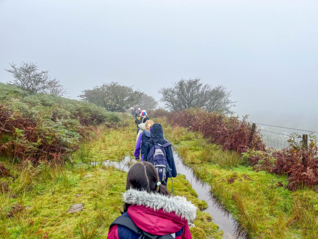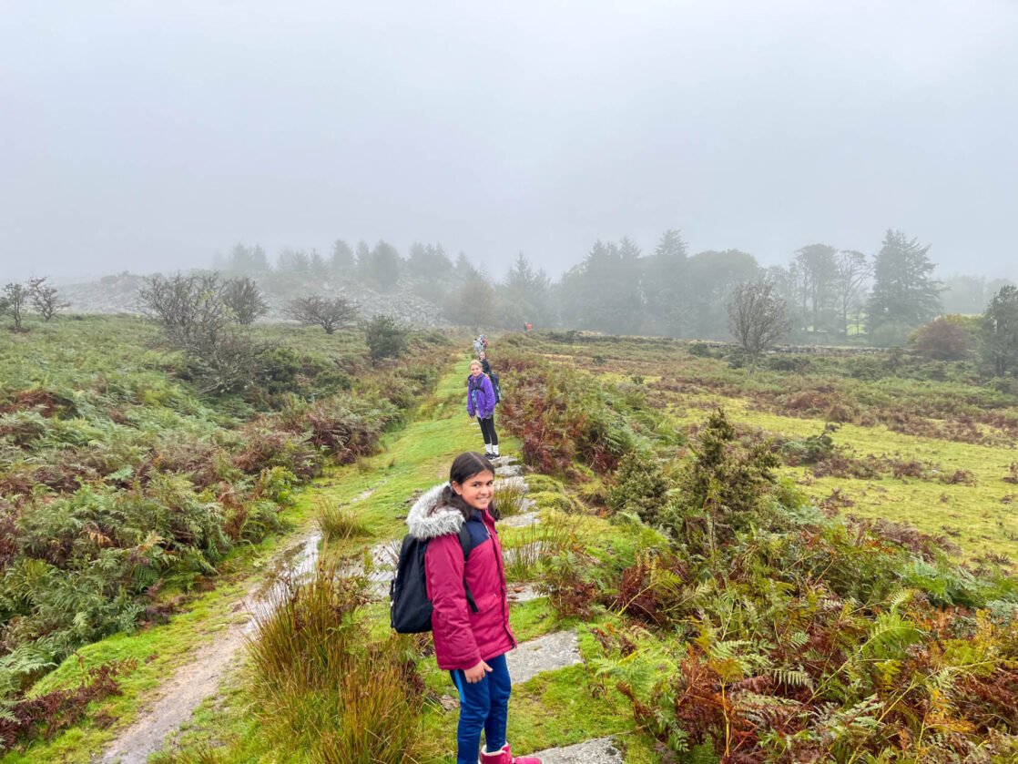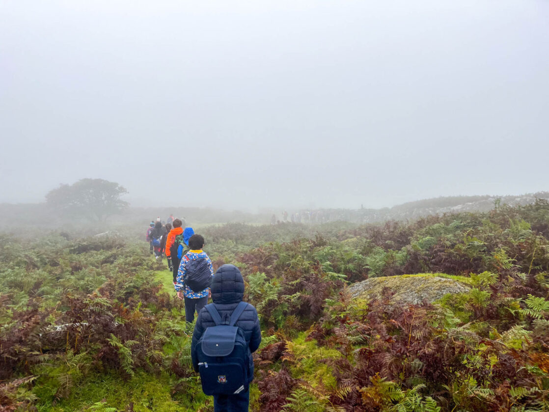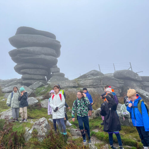 The circular walk began with a climb up Stowes Hill, which involved navigating across a boulder field in the fog. At the top, pupils paused to admire views of Brown Willy and Rough Tor. From there, the group passed the Cheesewring, a dramatic granite formation near the village of Minions on the eastern side of the moor. Its name is thought to come from its likeness to a pile of cheeses once pressed in a cider press.