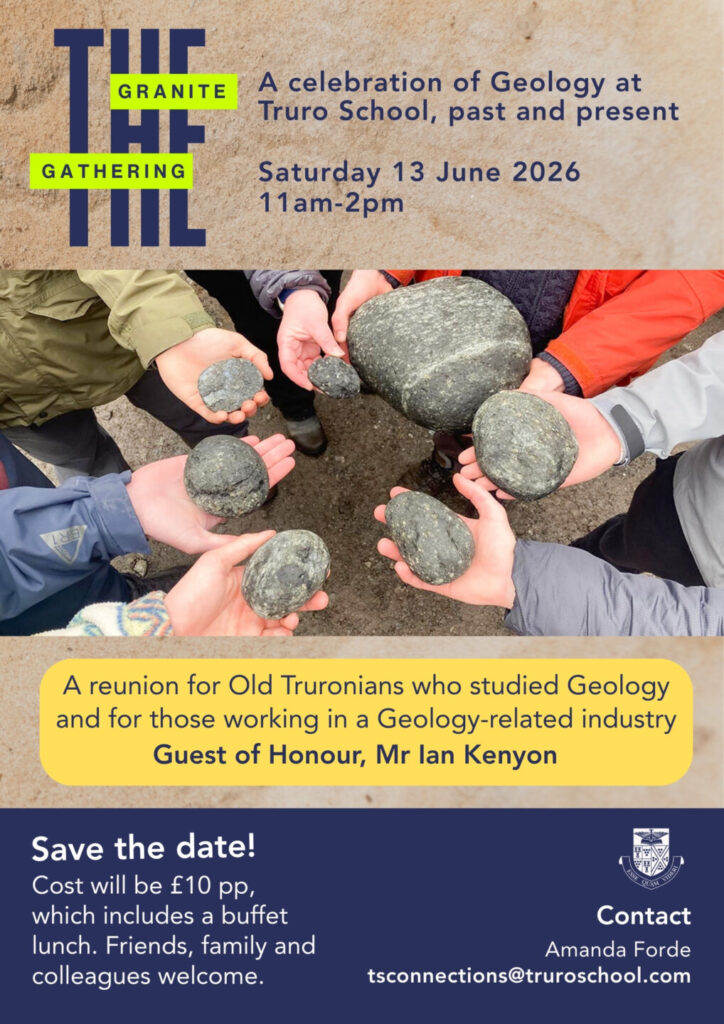 He is looking forward to catching up with Old Truronians at the Geology reunion The Granite Gathering on Saturday 13 June where he will be guest of honour. The programme for the day will include a buffet lunch in the Dining Hall, tours of the Geology classrooms, followed by a trip to the pub after!