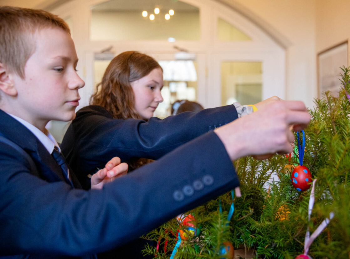 Using young blossom branches arranged in vases, our pupils have created two beautiful Easter trees, now proudly displayed in the Senior School Reception. The tree is decorated with painted eggs, alongside ribbons and garlands, adding a bright and cheerful touch of spring to the campus.