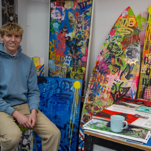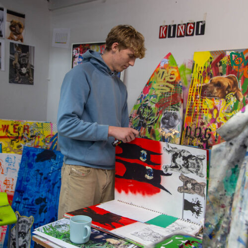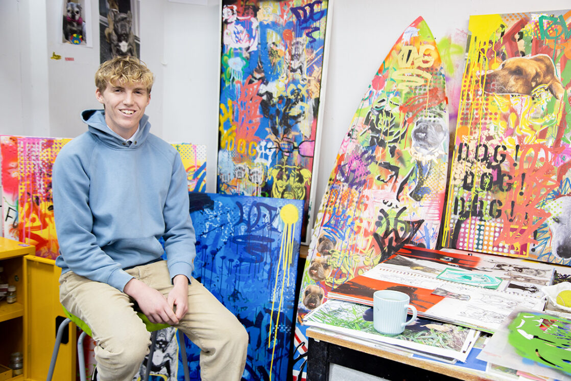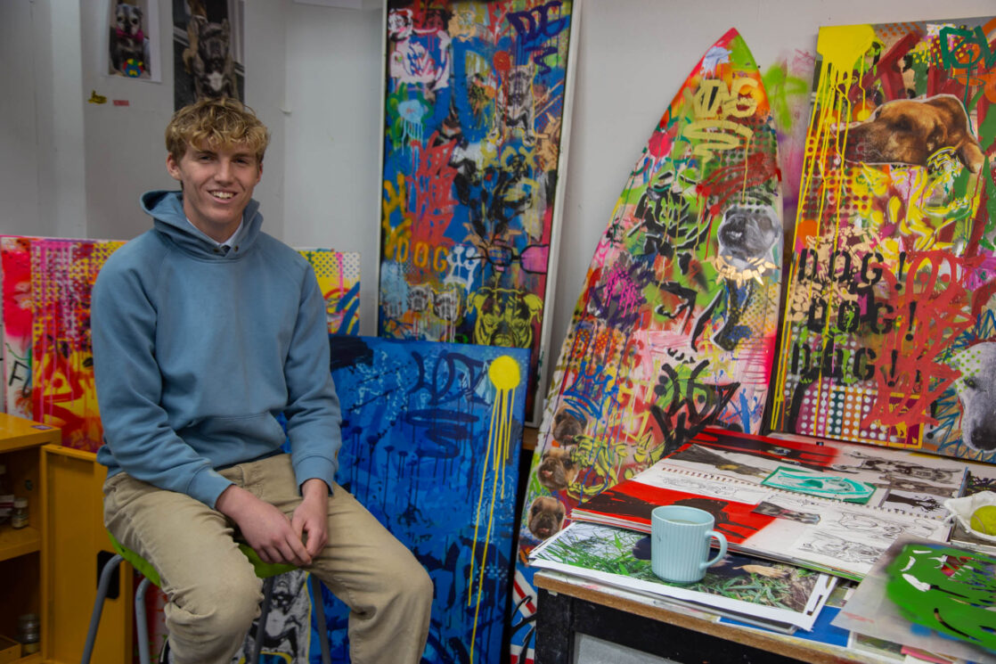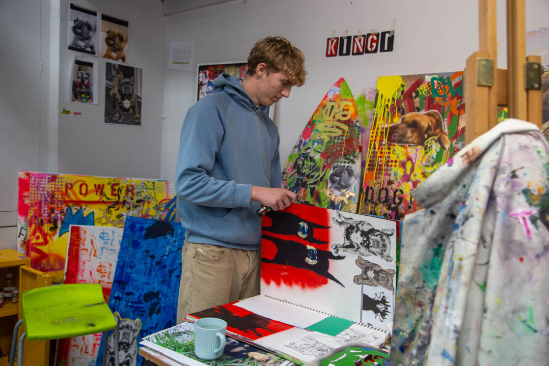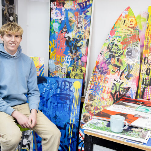Wilf has created a project inspired by street art, dogs and the work of Banksy and Mr Brainwash. His work features photographs of his own French Bulldogs, Star and Sunny, alongside images of Sri Lankan street dogs taken during a recent trip. These have been translated onto large boards and surfboards. Wilf has enjoyed the independence of working in the dedicated Sixth Form Art studio, which has allowed him to develop his own style. Studying Art alongside Business, the Leiths Diploma and the EPQ, Wilf plans to take a ‘gap-life’ after leaving school, travelling abroad and working surf, ski and yacht seasons. He credits the Leiths course with giving him the confidence to apply for roles such as chalet host and yacht crew.