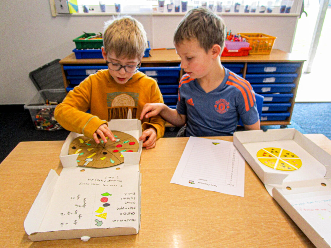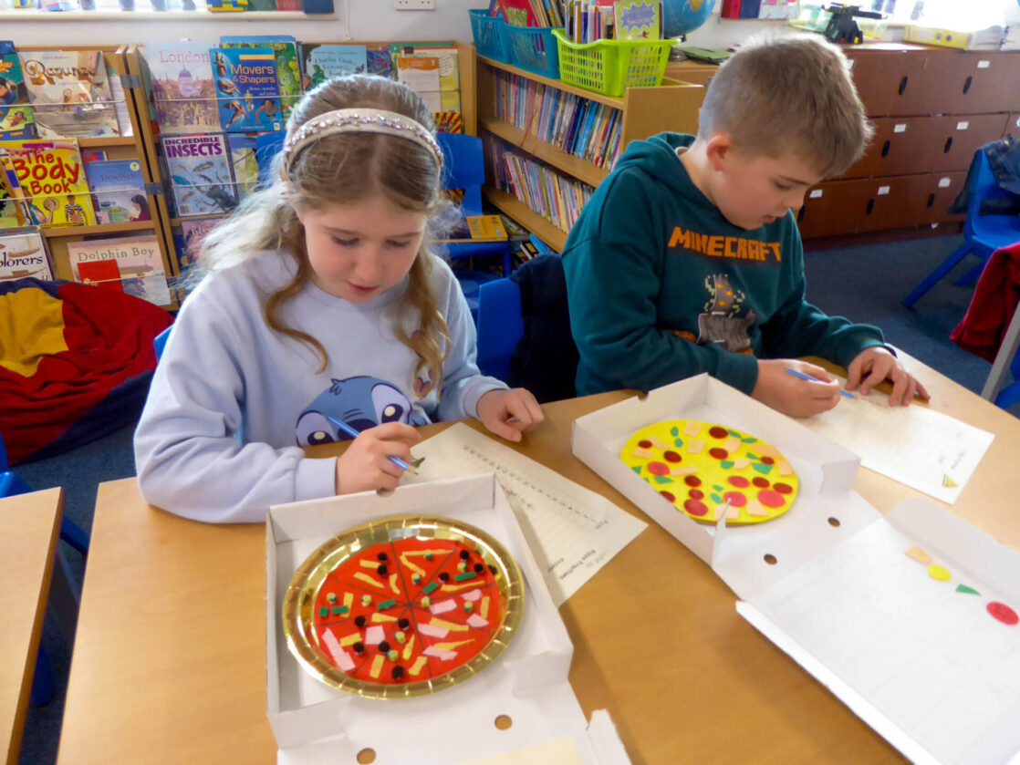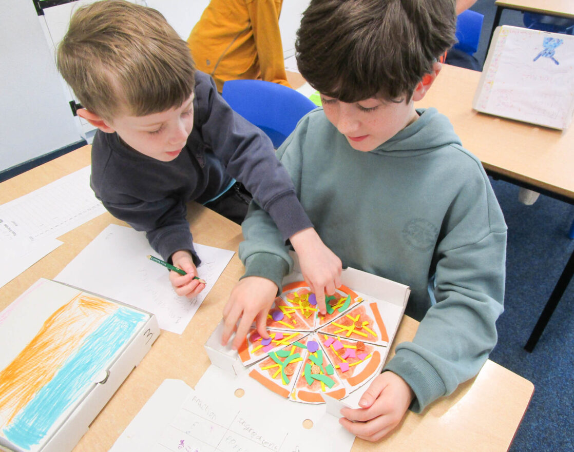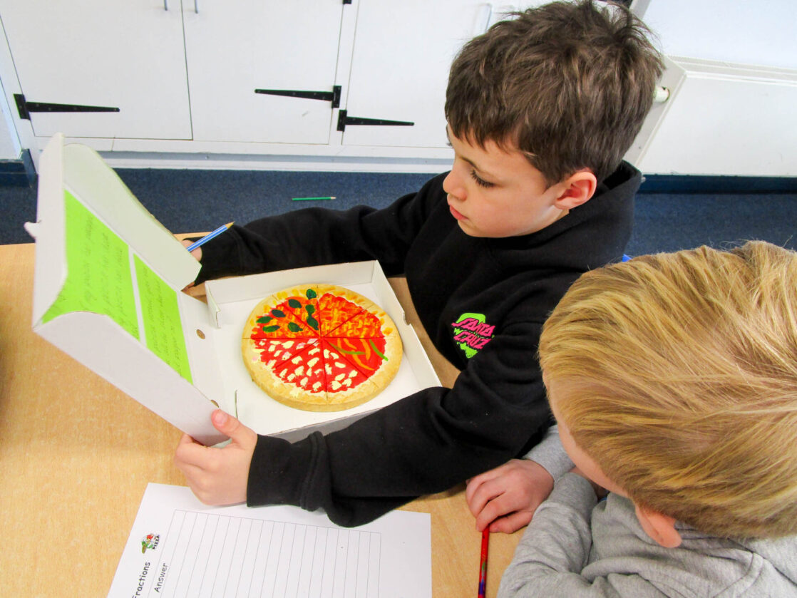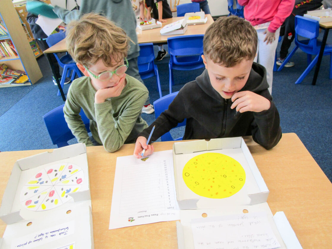 Pupils also wrote their own fraction-based questions linked to their pizzas that were shared with classmates, who worked together to solve the problems, discuss their reasoning, and explore which questions were more challenging and why.