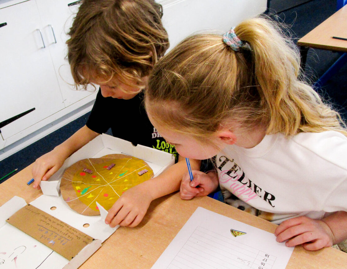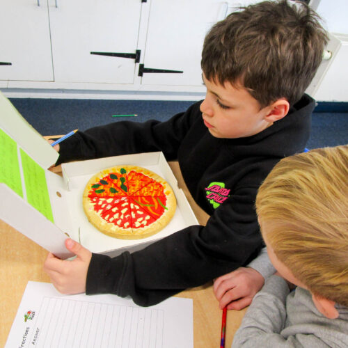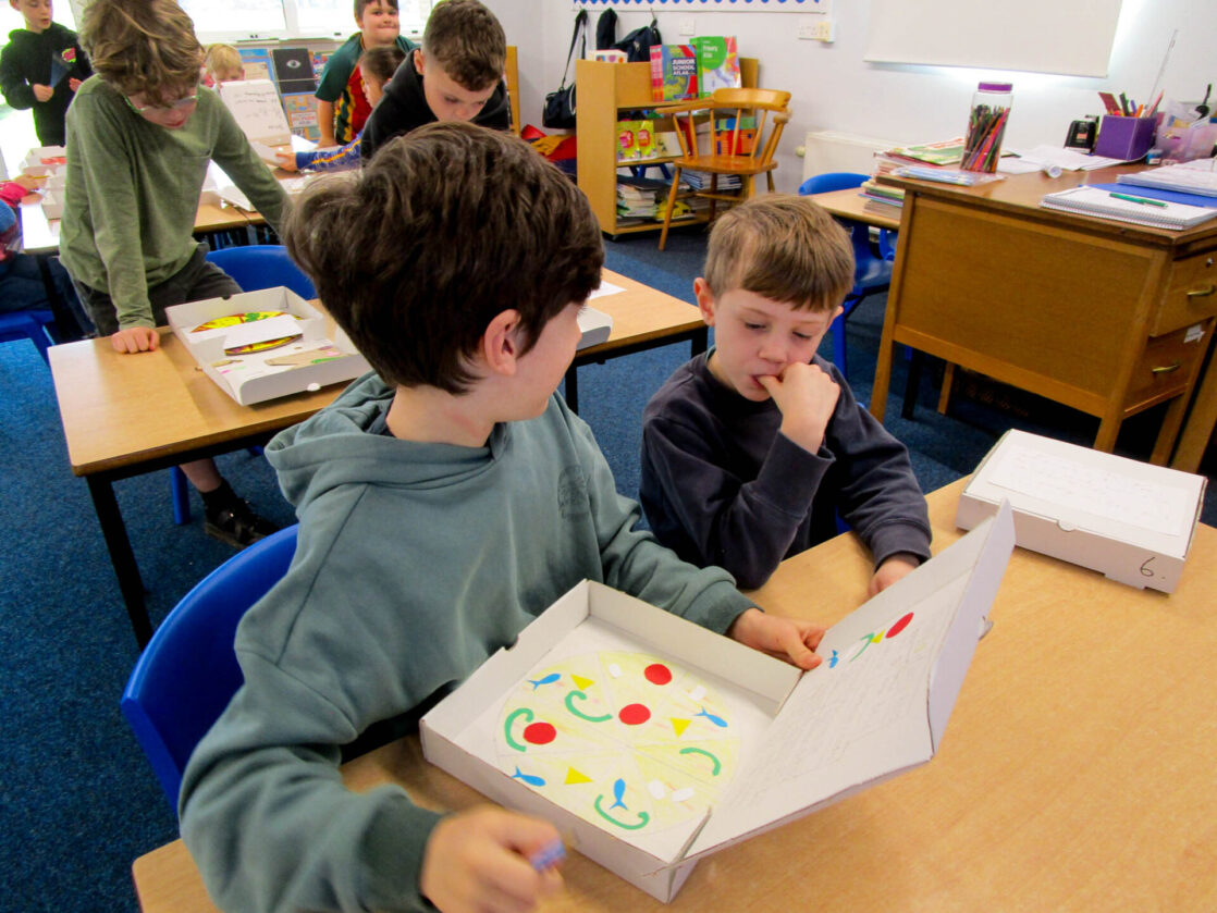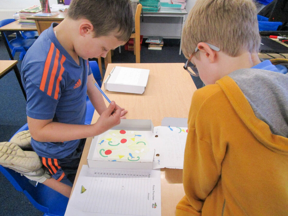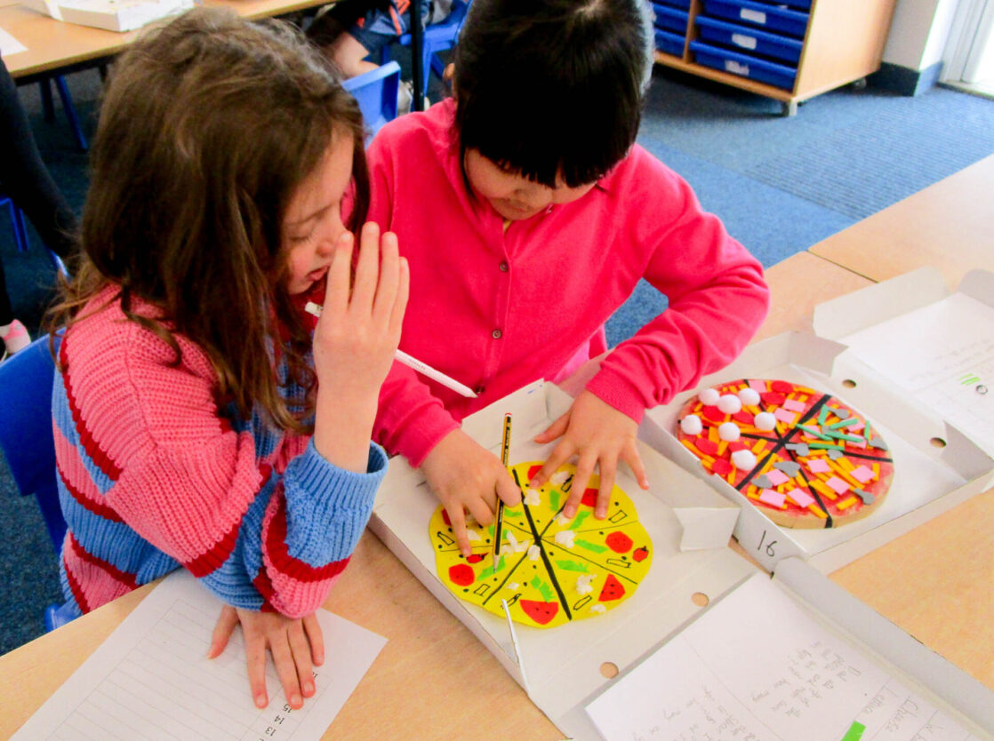 Pupils also wrote their own fraction-based questions linked to their pizzas that were shared with classmates, who worked together to solve the problems, discuss their reasoning, and explore which questions were more challenging and why.