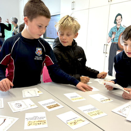The education team had also prepared a selection of original Tudor documents for the children to investigate. These included wills and inventories from Tudor men and women, as well as letters connected to both Elizabeth I and Henry VIII. One particularly exciting document concerned the re-siting of Kea Church and carried the signature of Henry VIII himself, giving the children the chance to see the handwriting of the famous king from more than 500 years ago.