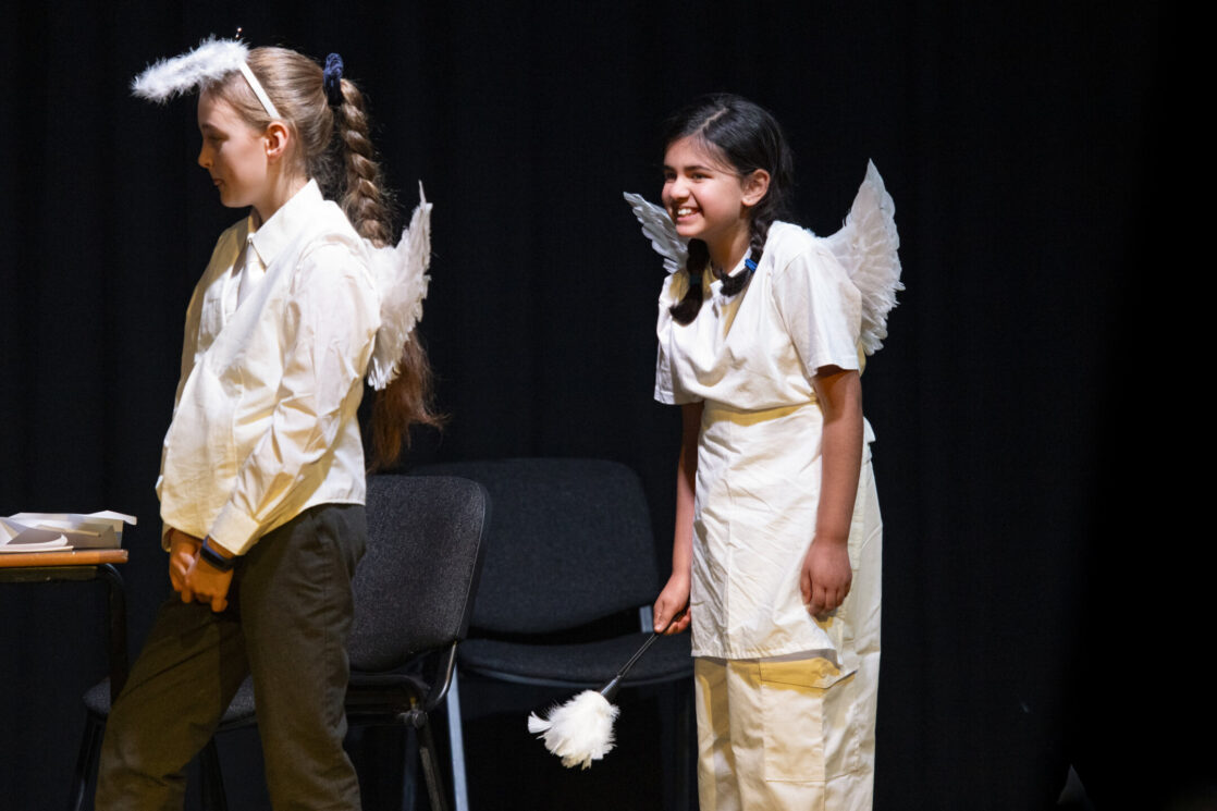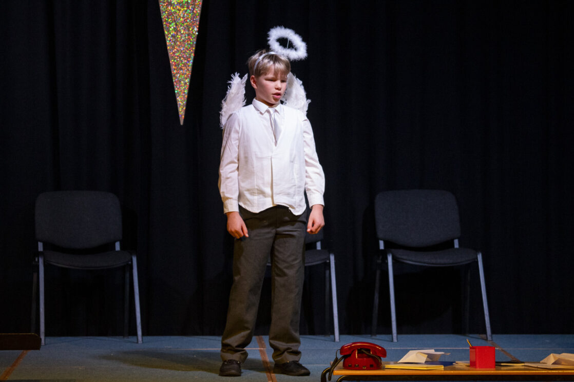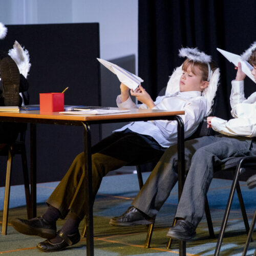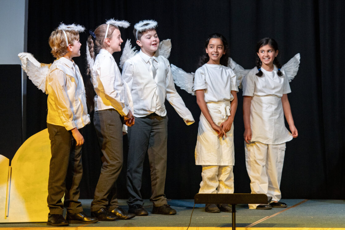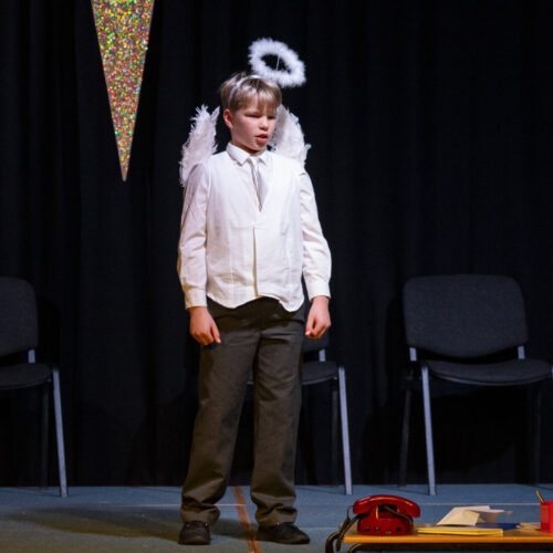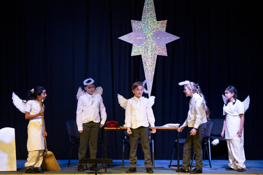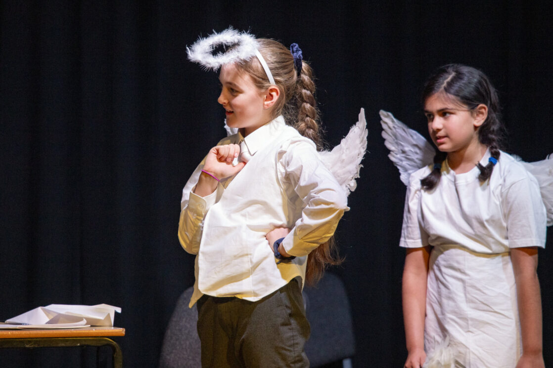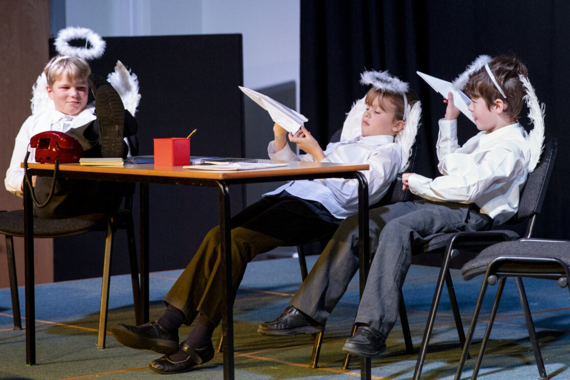 The play opens in 1BC, where work at “Divine Interventions” appeared quiet, until The Boss called with an urgent mission. From there, the audience was treated to a delightful journey through three acts, each led by a different Year 5 form. With the three archangels reappearing throughout the story, multiple pupils had the chance to step into their shining shoes, bringing humour, warmth and character to these iconic roles.