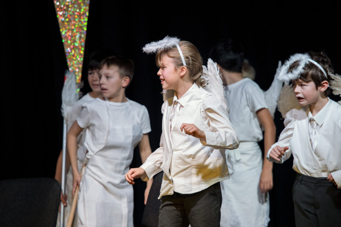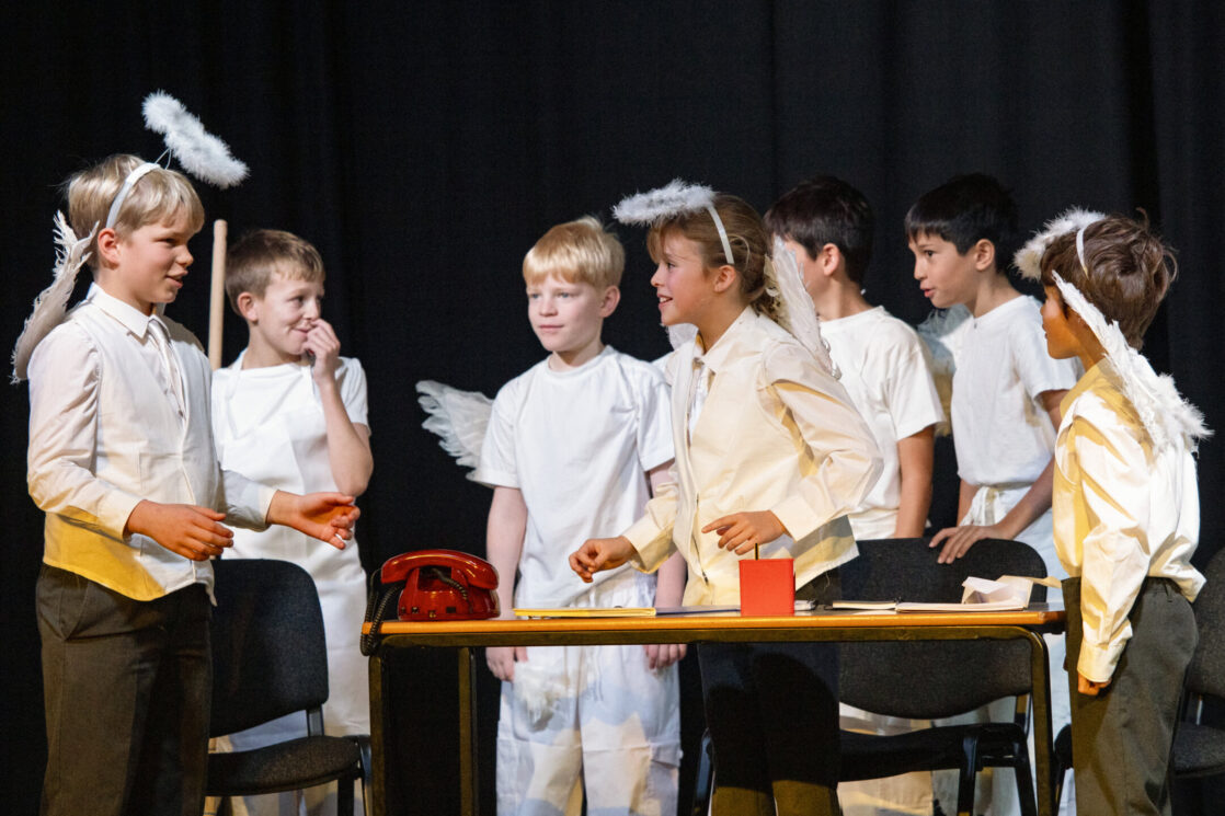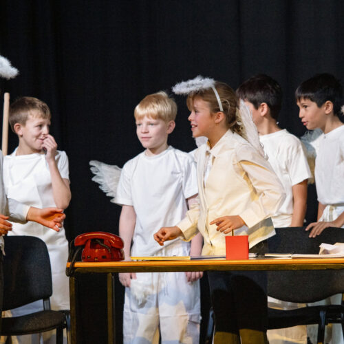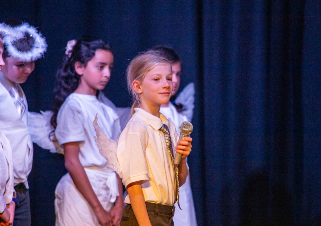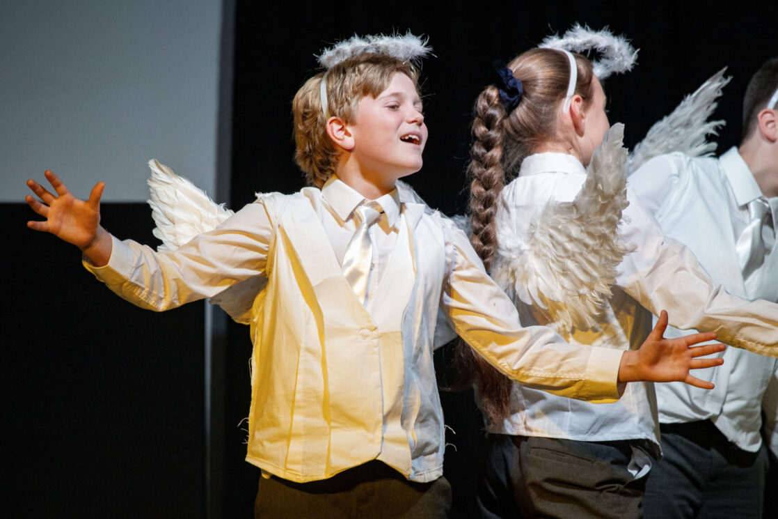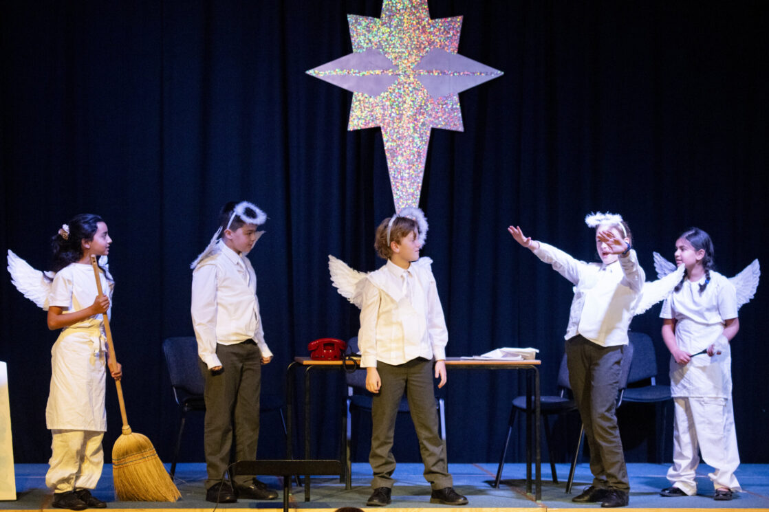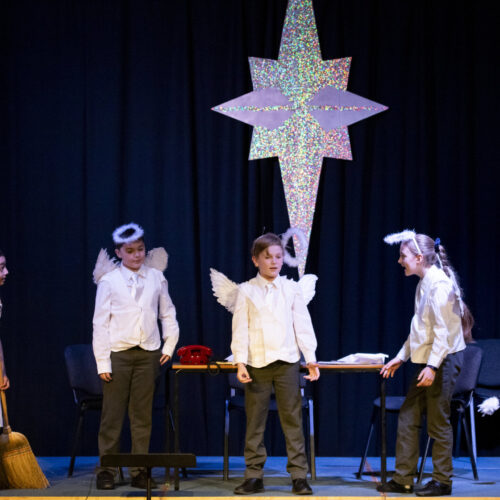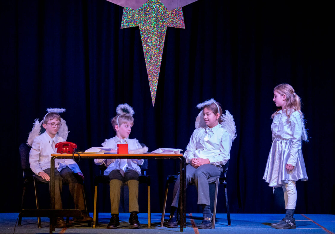 The play opens in 1BC, where work at “Divine Interventions” appeared quiet, until The Boss called with an urgent mission. From there, the audience was treated to a delightful journey through three acts, each led by a different Year 5 form. With the three archangels reappearing throughout the story, multiple pupils had the chance to step into their shining shoes, bringing humour, warmth and character to these iconic roles.