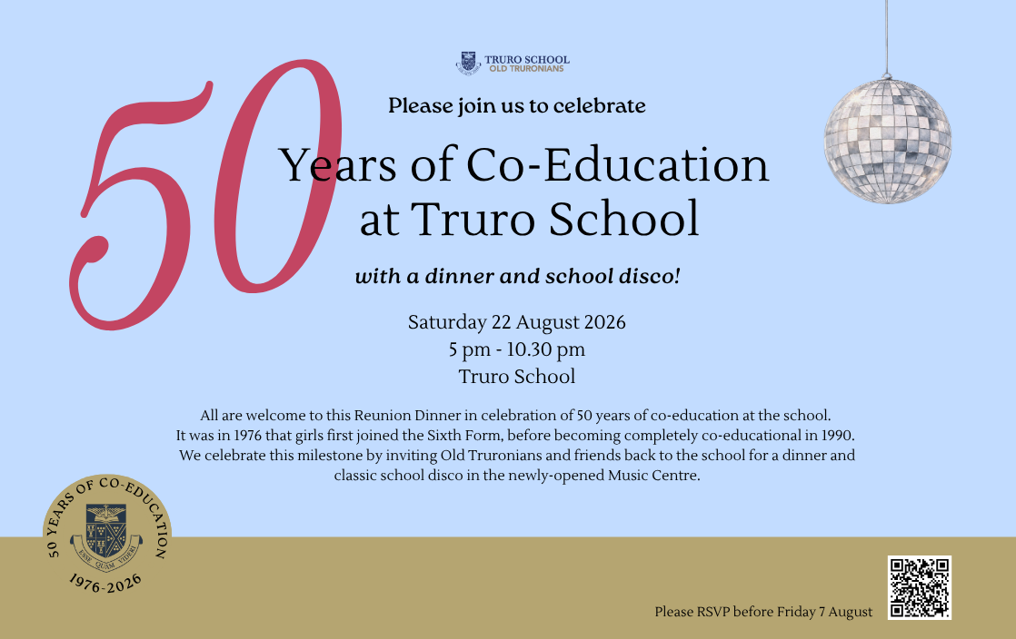 All are welcome to this Reunion Dinner in celebration of 50 years of co-education at the school. It was in 1976 that girls first joined the Sixth Form, before becoming completely co-educational in 1990. We celebrate this milestone by inviting Old Truronians and friends back to the school for a dinner and classic school disco in the newly-opened Music Centre.
